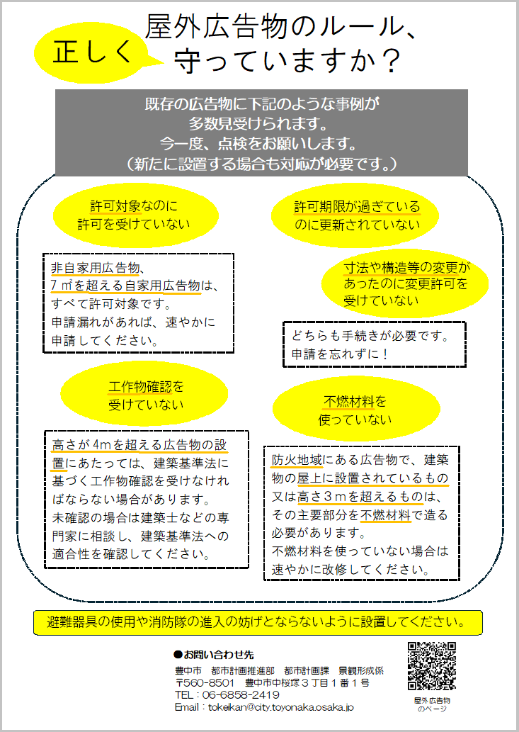 屋外広告物の設置については、豊中市屋外広告物条例のほか、建築基準法にも規定がありますので、適切に行ってください。